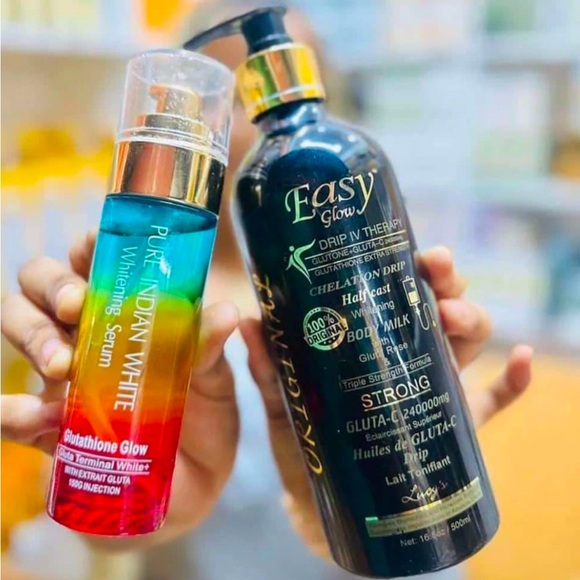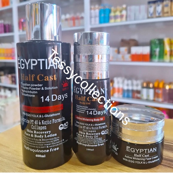 Includes whitening body oil and lotion. Features egg yolk and L-glutathione. Promises results in 14 days.